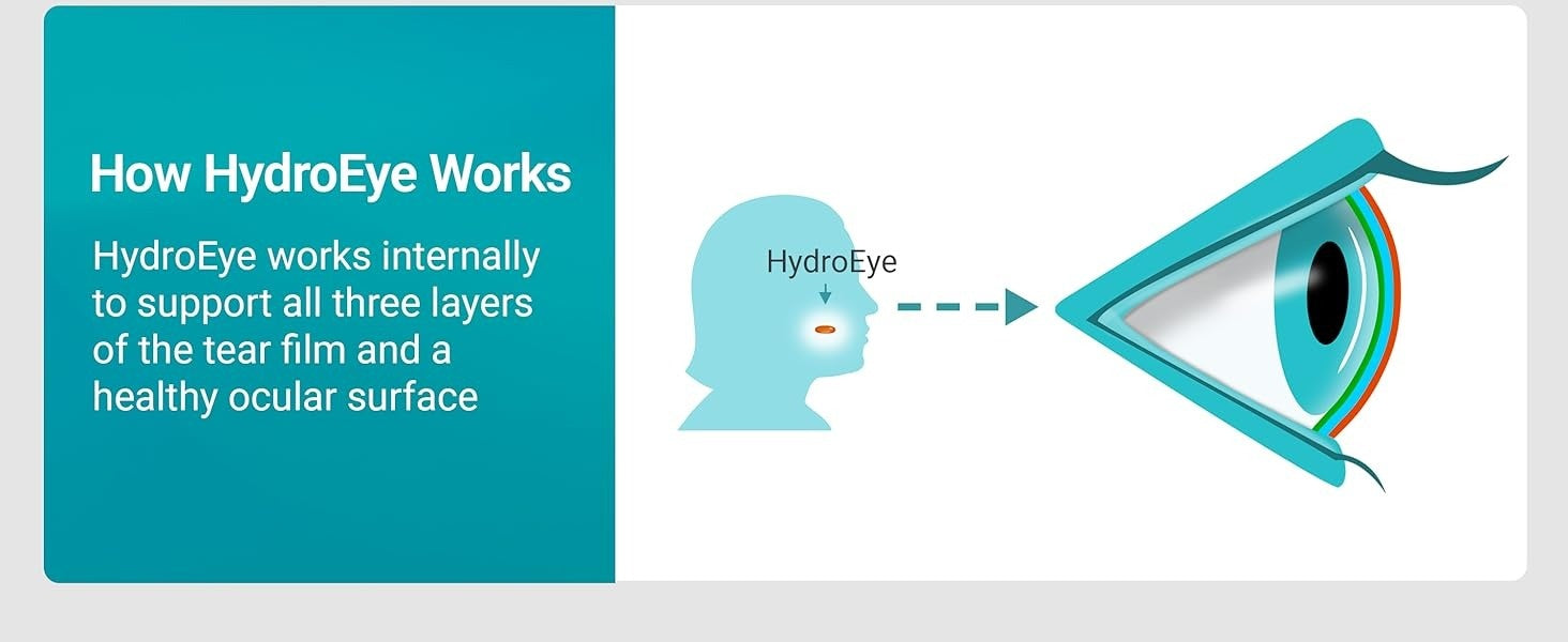 HydroEye is an oral formulation that works from the inside out to target the root causes of dry eye. Unlike topical products like drops and artificial tears, HydroEye does not require frequent re-application throughout the day. HydroEye provides uninterrupted relief within 30-60 days.